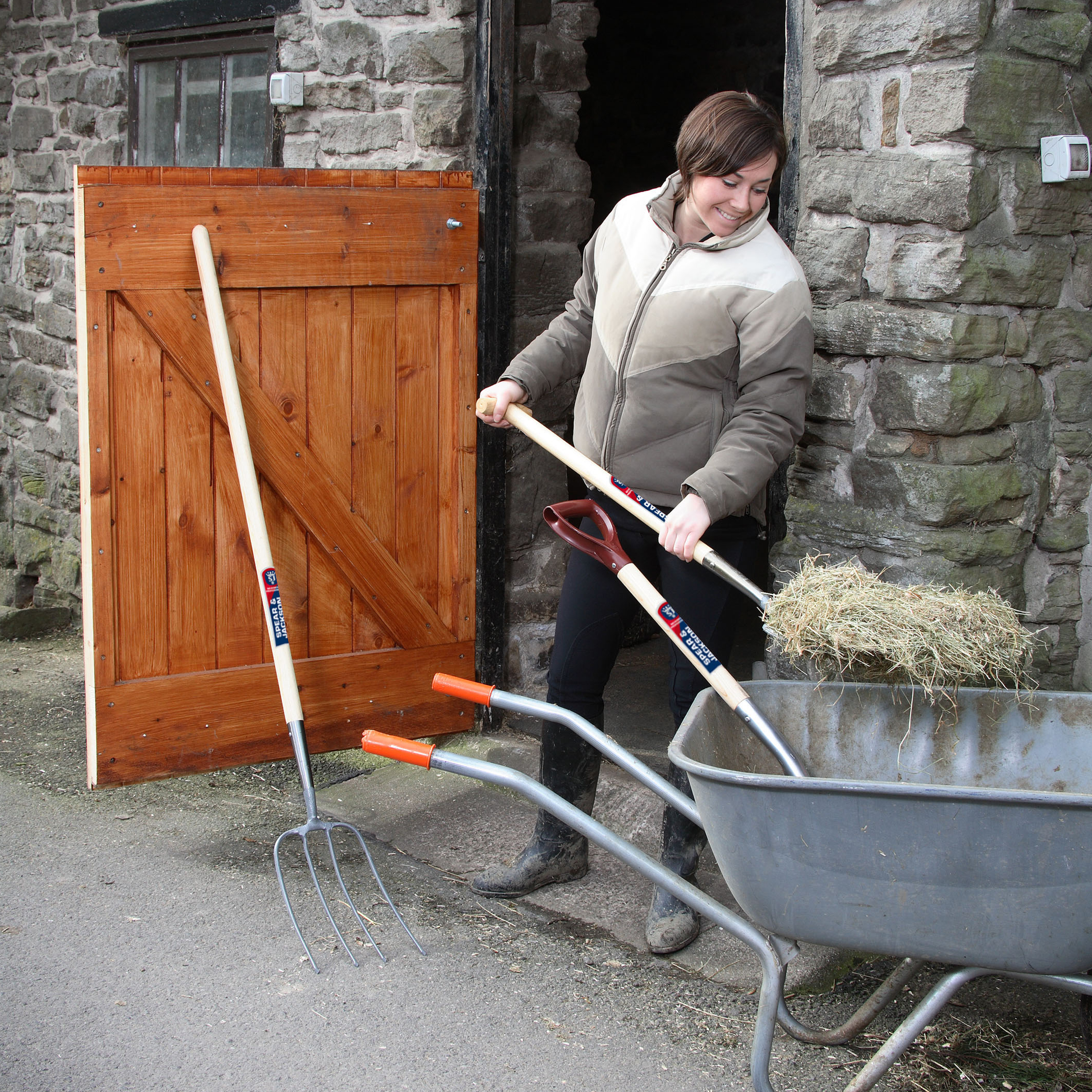 A traditional style 4 tine fork for raking manure